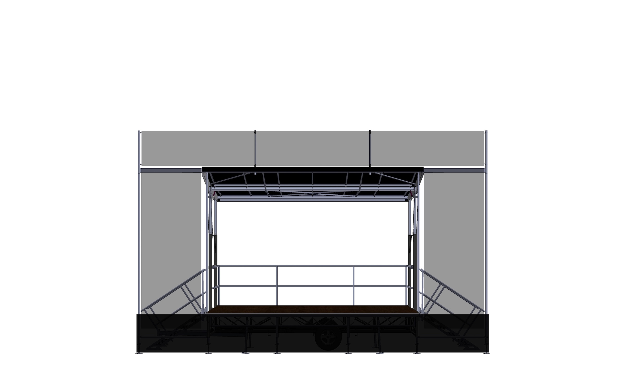 Entry-Level staging solution with 210 sq ft deck area. Perfect for smaller events, DJ's, Duos, and productions requiring less sound and lighting capabilities.